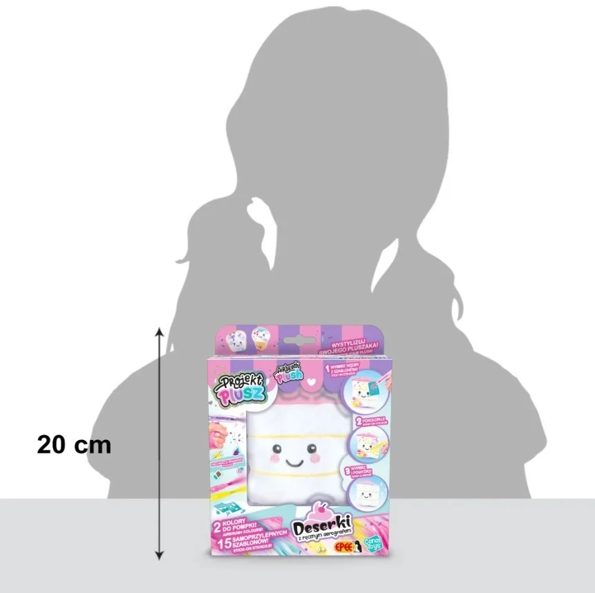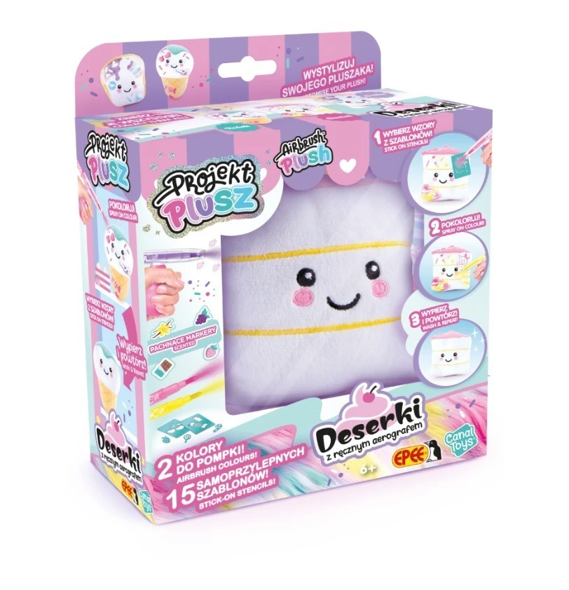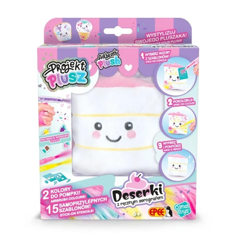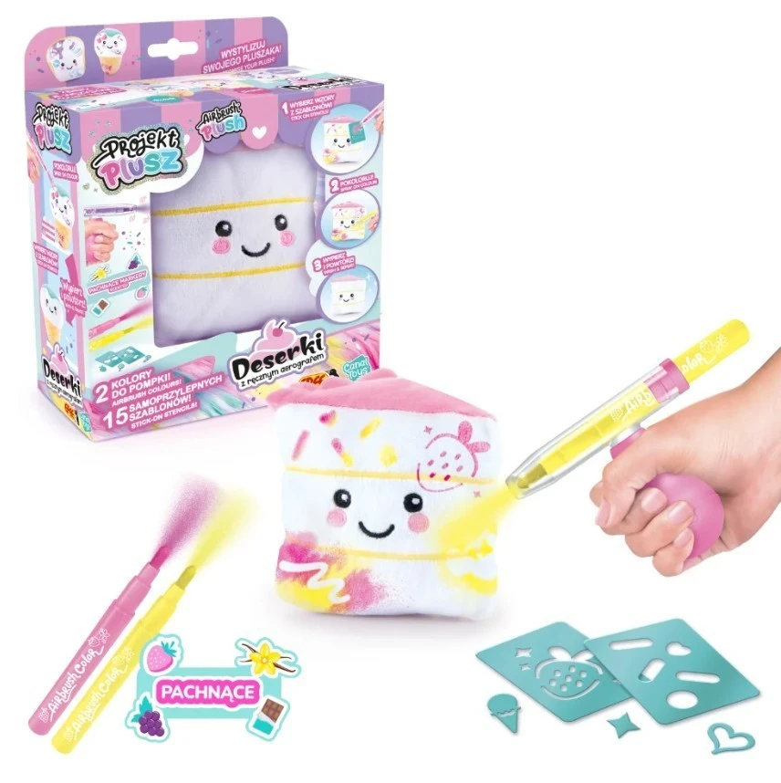 Projekt Plusz Deserki - Kreatywny zestaw z ręcznym aerografem Projekt Plusz to jedyna w swoim rodzaju linia pluszaków, które możesz dekorować bez końca! Dzięki dołączonemu aerografowi nadasz swoim Deserkom unikalny wygląd, a gdy najdzie Cię ochota na zmiany - możesz je po prostu wyprać i zacząć całą zabawę od nowa! Dlaczego Twoje dziecko pokocha Projekt Plusz? Nieograniczona kreatywność: Wystarczy użyć ręcznego aerografu i zmywalnych, pachnących markerów, aby tworzyć dowolne wzory. 15 samoprzylepnych szablonów: Do dekorowania nie trzeba posiadać zdolności artystycznych - dzięki naklejanym szablonom wielokrotnego użytku wzory zawsze będą wyglądać profesjonalnie.