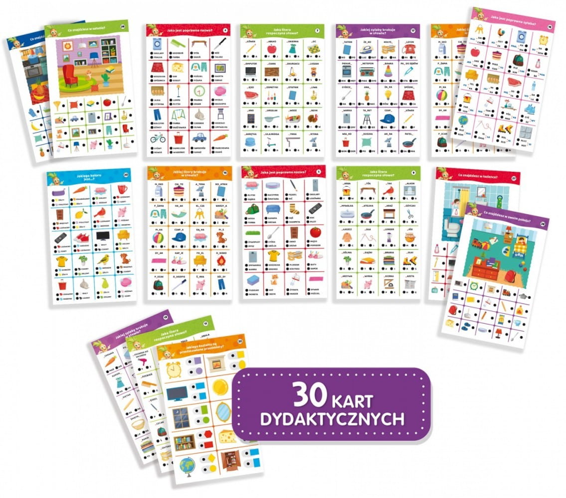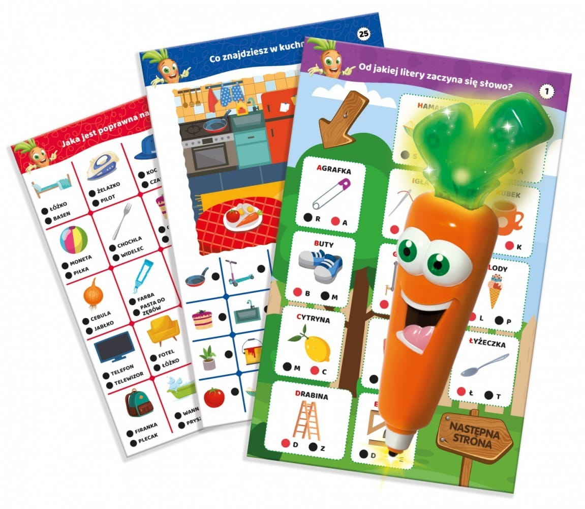 Gra Carotina 500 pytań - Mój dom 500 pytań Carotiny pomoże dziecku poznać wiele przedmiotów z domu i jego otoczenia dzięki 30 interaktywnym kartom edukacyjnym. Wystarczy użyć mówiącej i świecącej Carotiny, aby odpowiedzieć na pytania, naciskając końcówką długopisu czarne kropki przypisane do odpowiedzi.