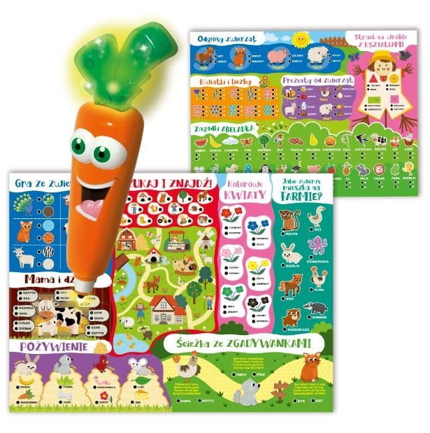 Laboratorium 50 gier z Carotiną to bogaty zestaw stworzony z myślą o dzieciach w wieku przedszkolnym. Dzieci mają do dyspozycji grającą i podświetlaną Carotiną oraz wiele elementów wykonanych z grubego kartonu, przedstawiających sympatyczne zwierzęta i przedmioty ze świata farmy.